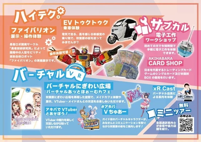 そしてVTuberがリアルな街をご案内する新感覚ツアー「アキバVちゅあー」が、にぎわい広場に初登場します。ガイド役のVTuberがツアー参加いただいたお客様と、リアルタイムにコミュニケーションを取りつつ、秋葉原の街を一緒に移動しながら案内します。