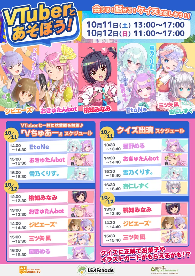 また、LEAFshadeのLEAF POPUPSTORE出張所もコーナー展開します。VTuberグッズの販売や、VTuberとトークできる無料交流体験、VTuebrの最新情報を掲載した自社広報誌『LEAFマガジン』の配布、VTuberカードゲーム『VoV(Virtual of Versus)』の体験・販売コーナーなどが楽しめる内容となっています。