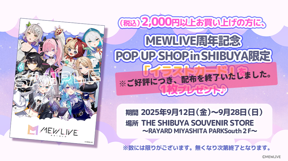 「THE SHIBUYA SOUVENIR STORE」にて、『MEWLIVE 周年記念POP UP SHOP in SHIBUYA』の商品を2,000円(税込)以上お買い上げの方に、「イラストカード」を1枚プレゼント!