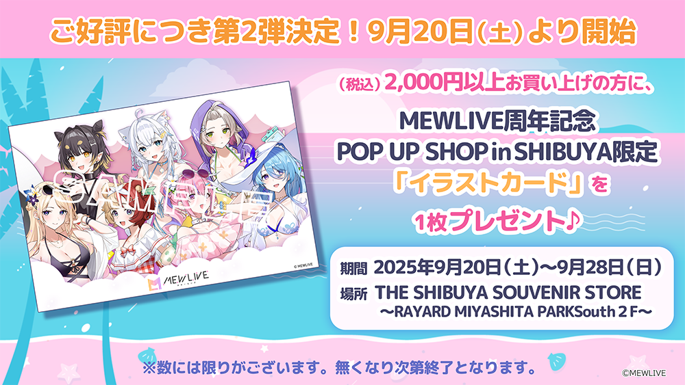 「THE SHIBUYA SOUVENIR STORE」にて、『MEWLIVE 周年記念POP UP SHOP in SHIBUYA』の商品を2,000円(税込)以上お買い上げの方に、「イラストカード」を1枚プレゼント!